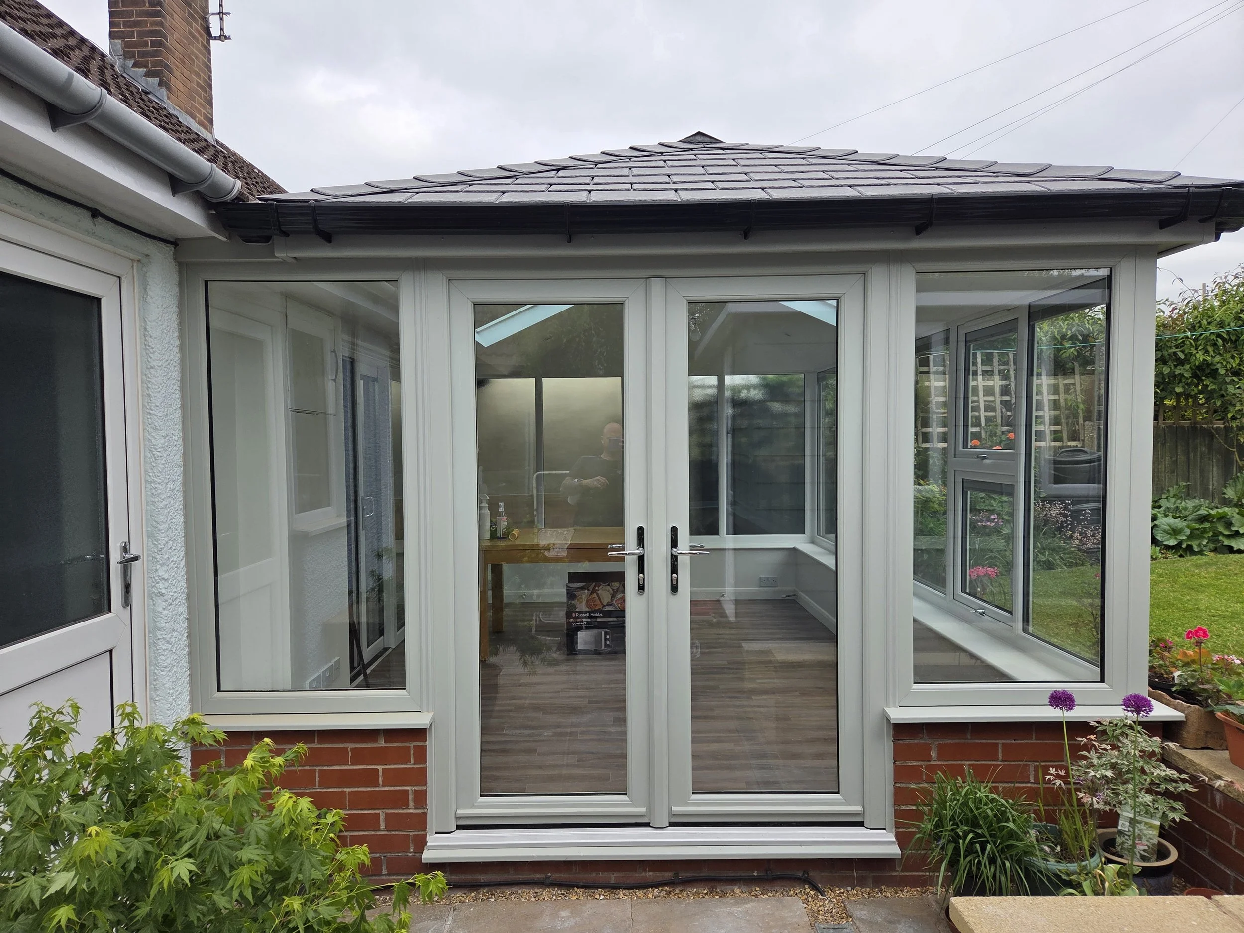 A modern conservatory with a gray frame and sliding glass doors, decorated with potted plants, in a backyard with a lawn, adjacent to a house with a chimney and tiled roof, under a cloudy sky.