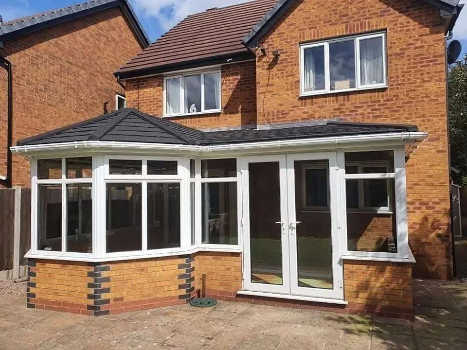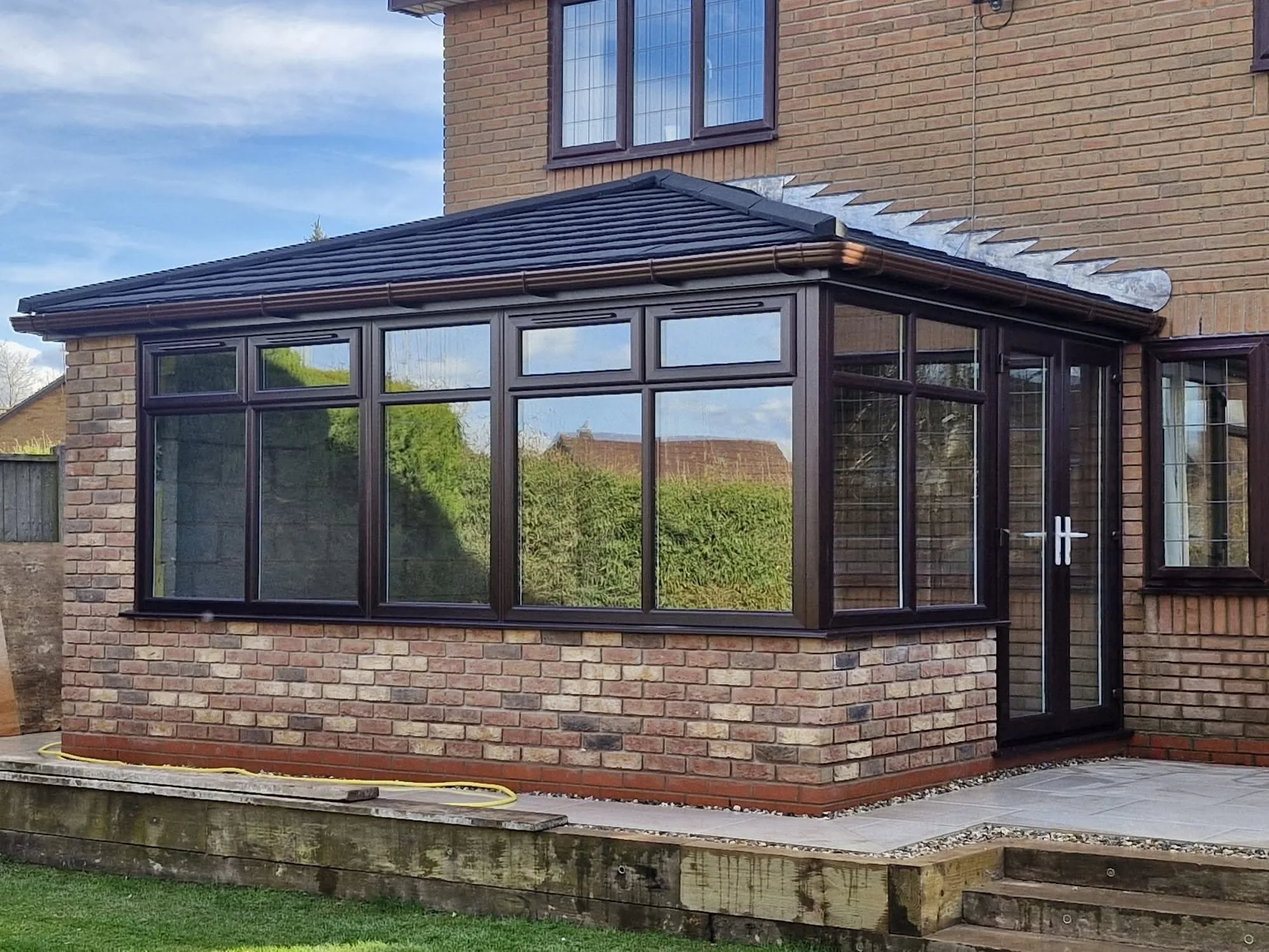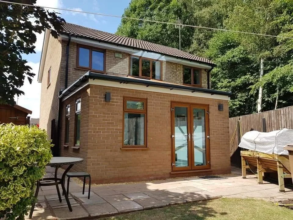 A newly built brick extension with large windows and a glass door, attached to a house. The extension has dark brown framed windows and a sliding door, with rain on the ground outside.