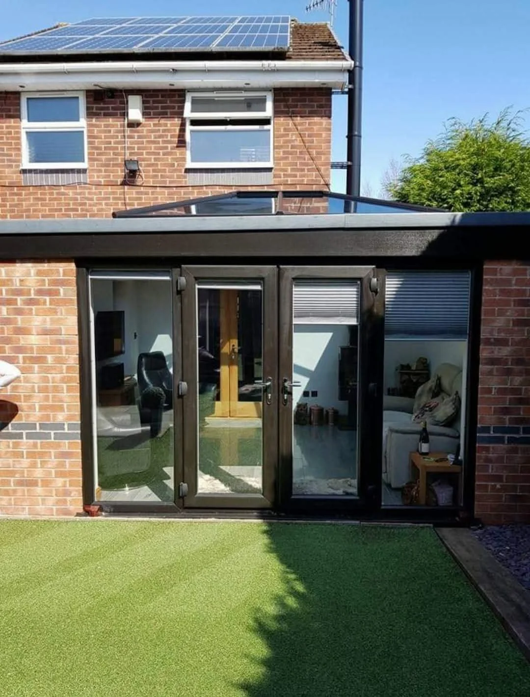 View of a brick house with solar panels on the roof and a glass conservatory with black framing; indoor furniture visible through the glass, and a green artificial grass lawn in the foreground.