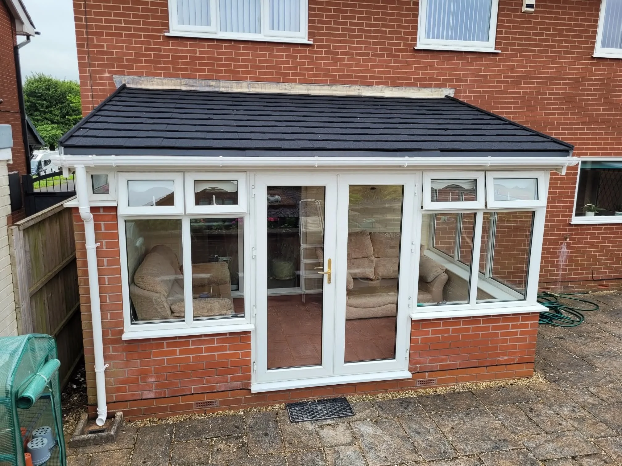 A small brick extension conservatory with white-framed windows and a black shingled roof, attached to a brick house in a backyard with paving stones.